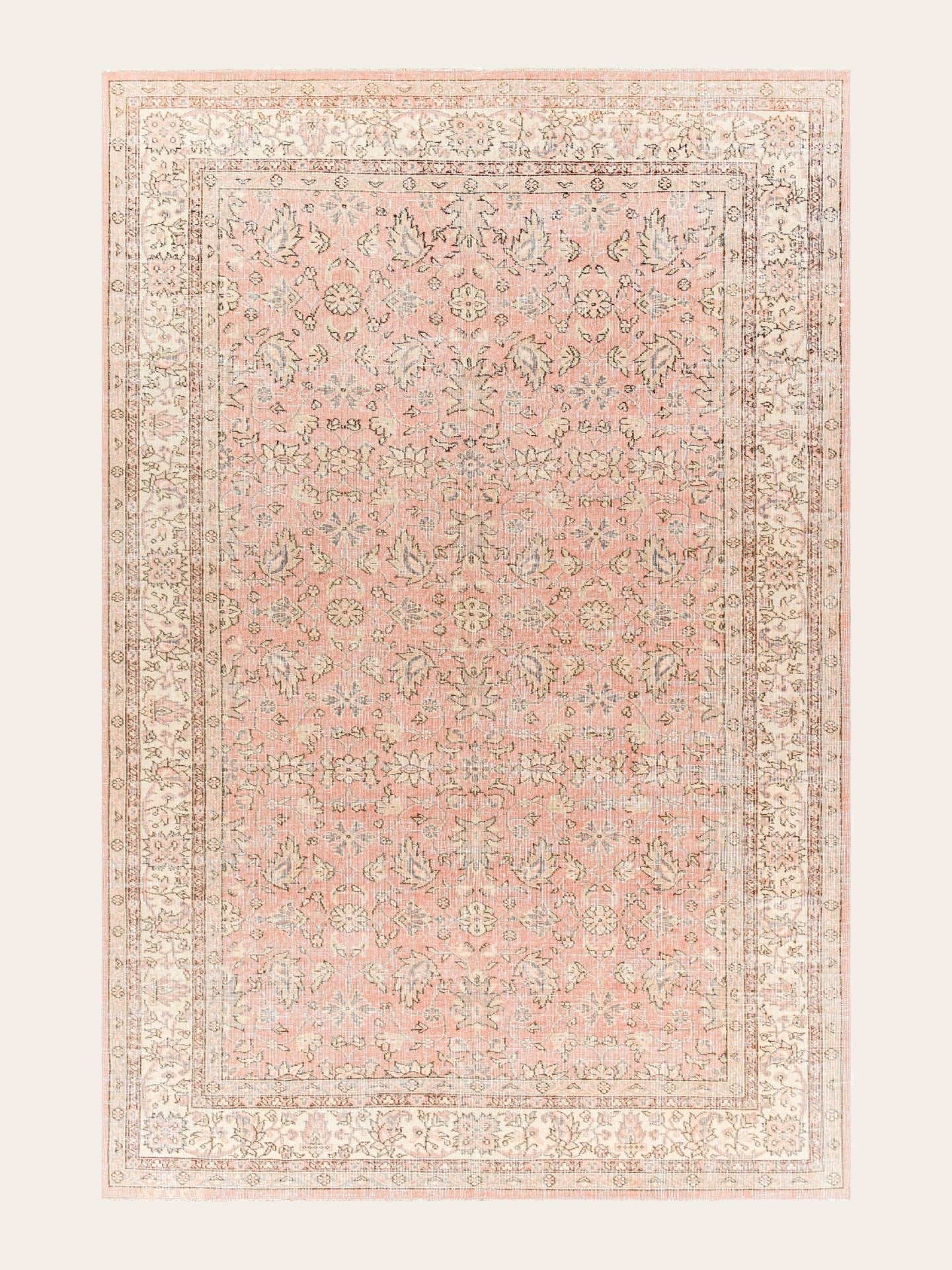 Selma Vera valt op door haar zachte roze basis met een verfijnd vintage patroon van bloemen en sierlijke details in lichte crème- en grijstinten. De subtiele rand omlijst het geheel en geeft het vloerkleed een rustige, doorleefde uitstraling. Het design voelt klassiek, maar past moeiteloos in een modern, vintage of boho interieur.